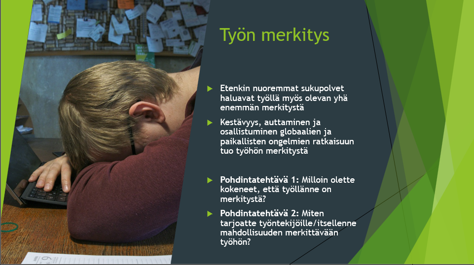 Työpajassa esittelimme kuusi trendiä: Pandemia-ajasta toipuminen, Itsensä johtaminen, Digitalisaatio, Työn merkitys, Väestön ikääntyminen ja Vastuullisuus. Työpajan edetessä pohdimme miten trendit vaikuttavat yrittäjien toimintaan ja tavoitteisiin, sekä keskustelimme näiden mahdollisesti tuomista haasteista.